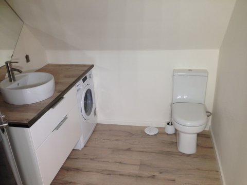Stueetagen: Indbyder med en rummelig gang, et moderne badeværelse med toilet, et stort stue-køkken alrum, og et generøst værelse.